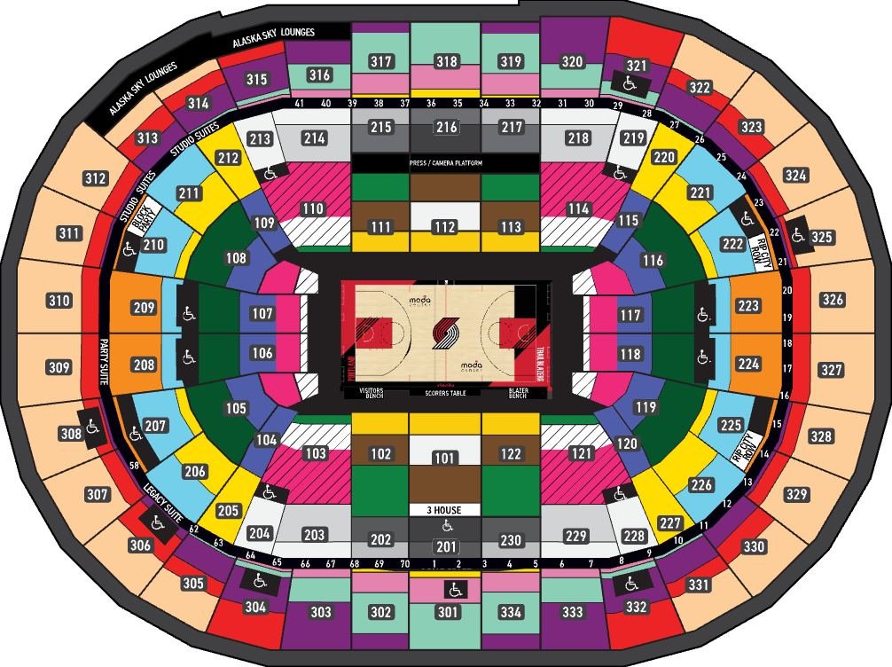 The Moda Center hosted various type games and the seating capacity of Moda Center are different as per the games. The seating capacity for basketball is 19393, 18280 for ice hockey/box lacrosse, approx. 20500 for center stage concert, approx. 15000 for end stage concert and approx. 6500 for Theatre of the Clouds. The seating of this arena is bifurcated in various levels. The Moda Center seating plan helps the visitors to understand the seat location and view while ticked booking or to check the reserved seat location. During online ticket booking of Rose Garden seating chart reflects the 3D View and price where visitor can choose the seat accordingly as per the budget. On the seating map of Moda Center all the facilities information related to restrooms, accessible seating area, food outlets etc. are clearly depicted.