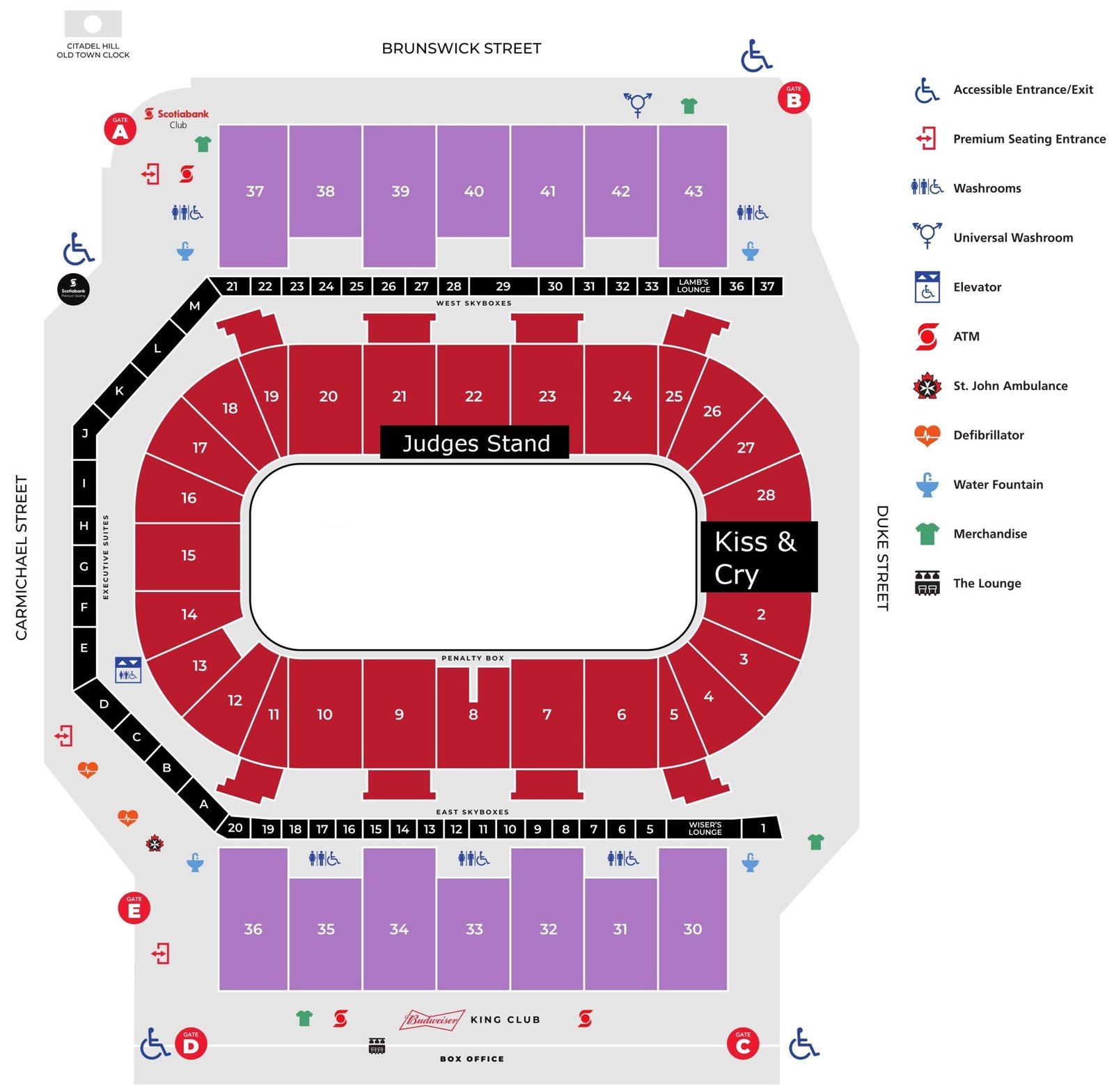 The Scotiabank Arena seating capacity varies different on the games and events. Scotiabank Arena seating map with seat numbers and rows helps visitors to find the best view seat. During online ticket booking of Scotiabank arena seating plan, with 3D seat view shows seat-wise price where visitors can choose the seat as per their choice and budget. The Scotiabank Arena seating capacity is 19800 for basketball & 202511 with standing room, 18800 for hockey/lacrosse & 20270 with standing room, 19800 for concerts and 5200 for theatre. All the facilities related to visitors’ comfort, like entry and exit gate location, washrooms, elevators, ATM, water fountains, accessible seating lounge, medical facilities etc. are depicted on the seating layout of Scotiabank Arena.