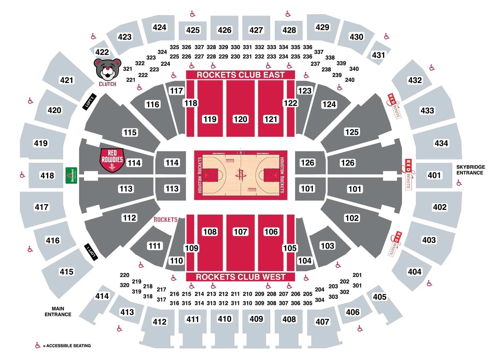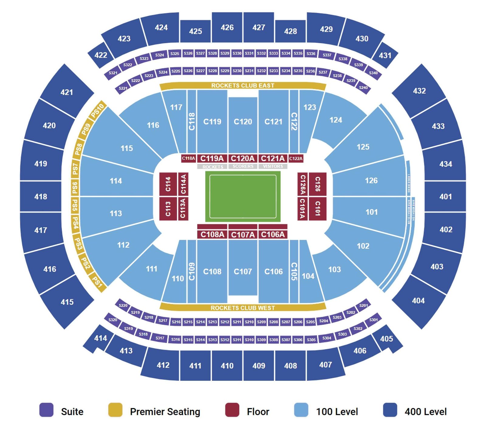 The Toyota Center seating capacity was 17982, which is currently 18055. The Toyota Center seating chart is helpful for visitors and fans to understand the seat location and to know the seat view. During online ticket booking of the Toyota Center seating map 3D view reflects the seat price, where visitor can choose the seat as per the view from the seat or their budget. The Toyota Center seating layout is divided into various seating sections, i.e., suite level, premier seating level, floor level, 100 level, and 400 level.